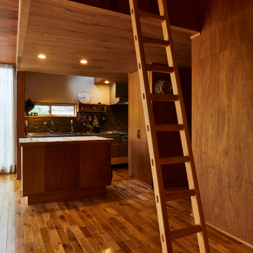 家族にとって大きすぎず小さすぎない、ちょうどいい距離感と、お互いの気配を感じられる空間構成としています。扉や仕切りを設けず、天井の高さや収納壁の配置で、ゆるやかにゾーンを分ける計画としました。山から吹く涼しい風が抜ける心地よさも、この家ならではの魅力です。