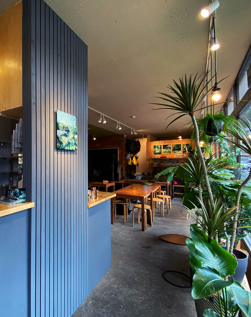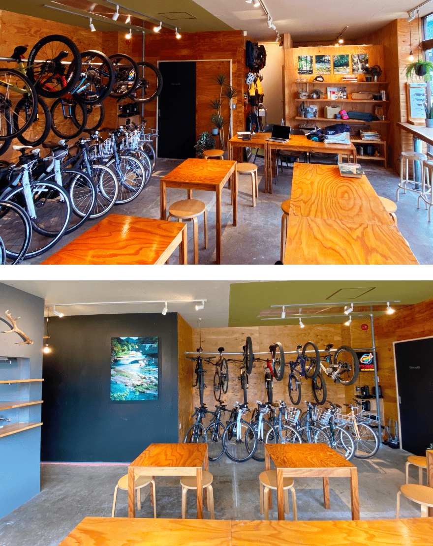 壁面には自転車をディスプレイできるラックを設置。屋内にいながらも自然を感じられる、心地よく開放的な空間に仕上げました。
