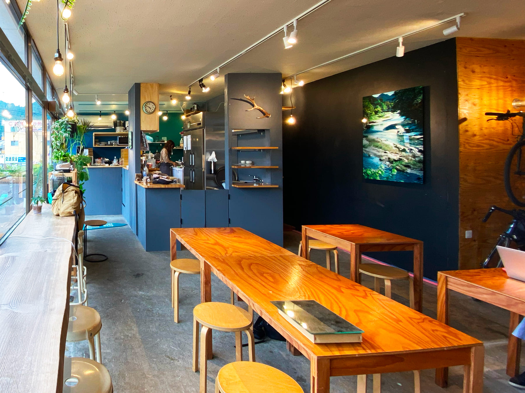 壁面には自転車をディスプレイできるラックを設置。屋内にいながらも自然を感じられる、心地よく開放的な空間に仕上げました。