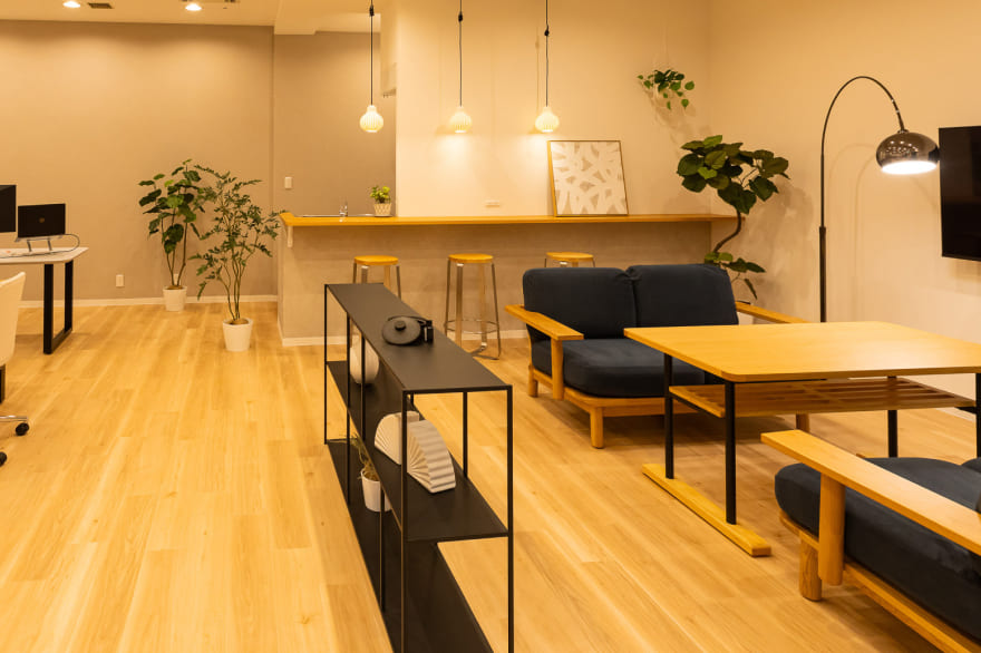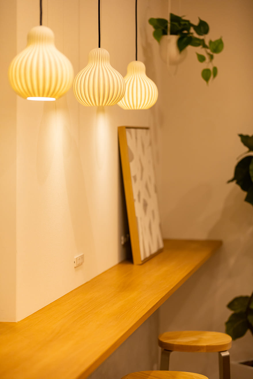 ペンダント照明でやわらかな光を演出。働く時間にもリラックスできる、穏やかで居心地の良いオフィスを目指しました。