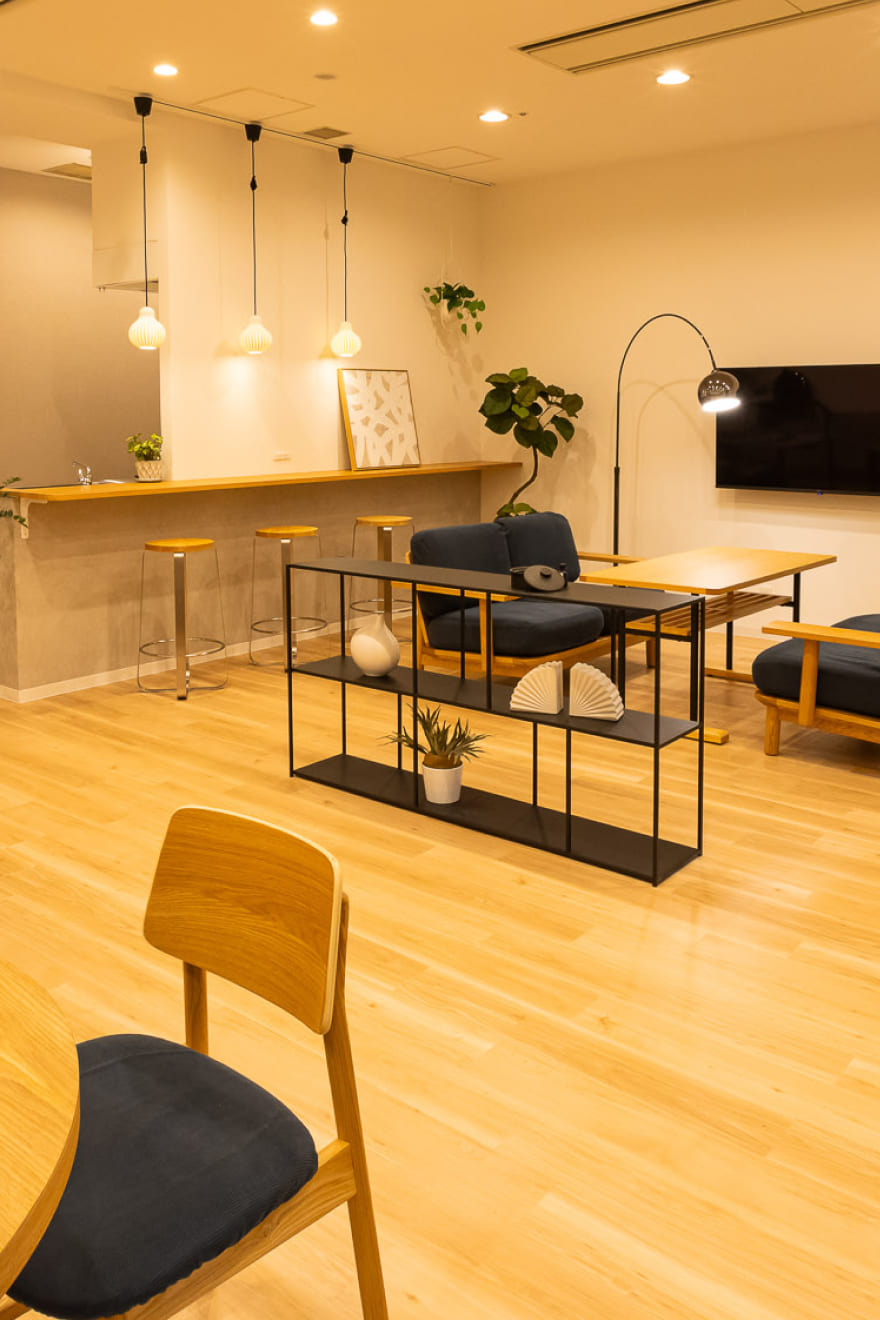 木の温もりを感じるナチュラルな素材を基調に、柔らかな照明とネイビーのファブリックを組み合わせました。カフェのように穏やかで居心地の良い空間となるよう意識しています。