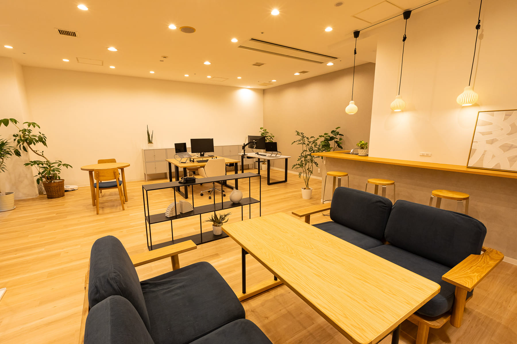 ペンダント照明でやわらかな光を演出。働く時間にもリラックスできる、穏やかで居心地の良いオフィスを目指しました。